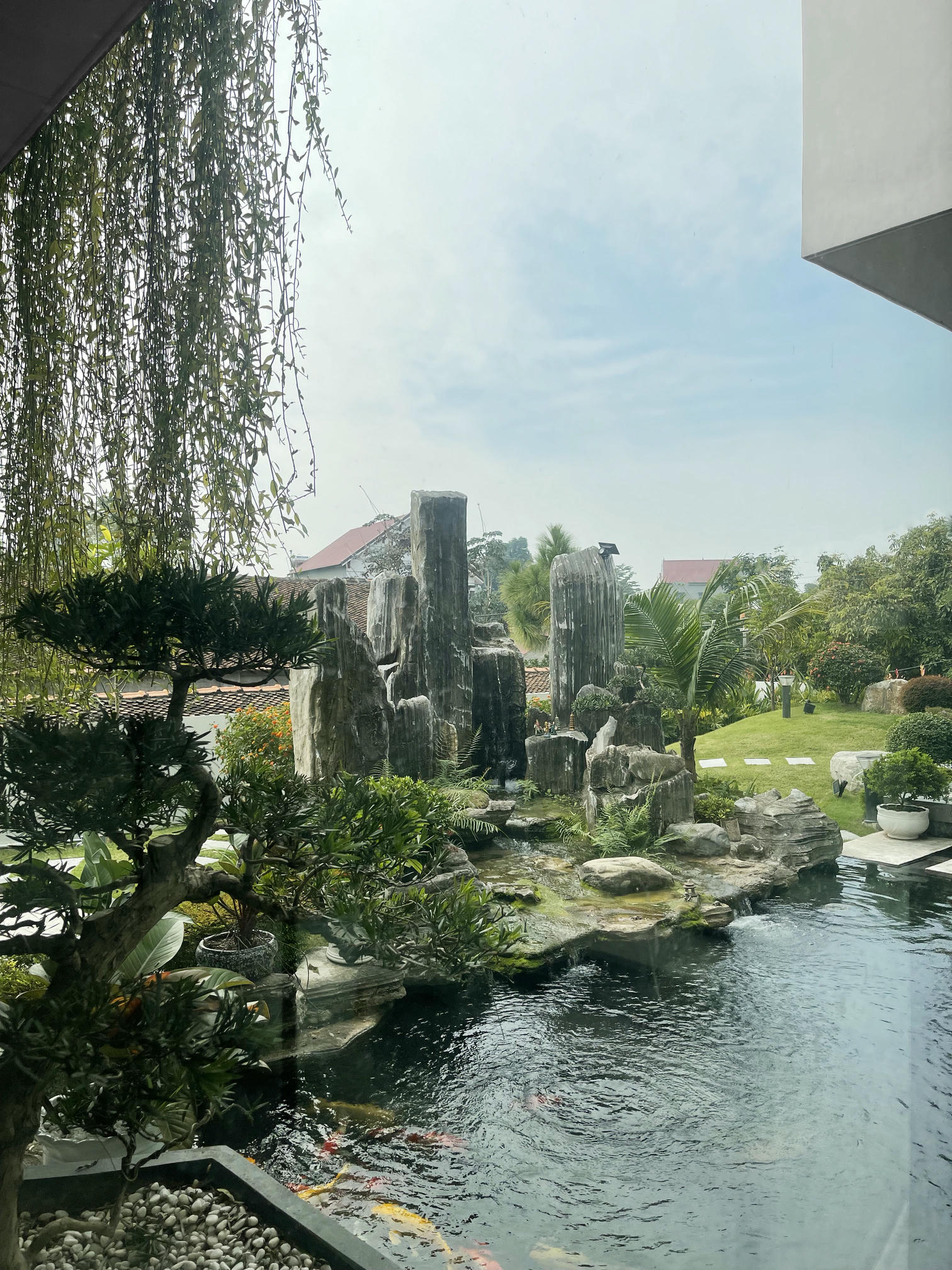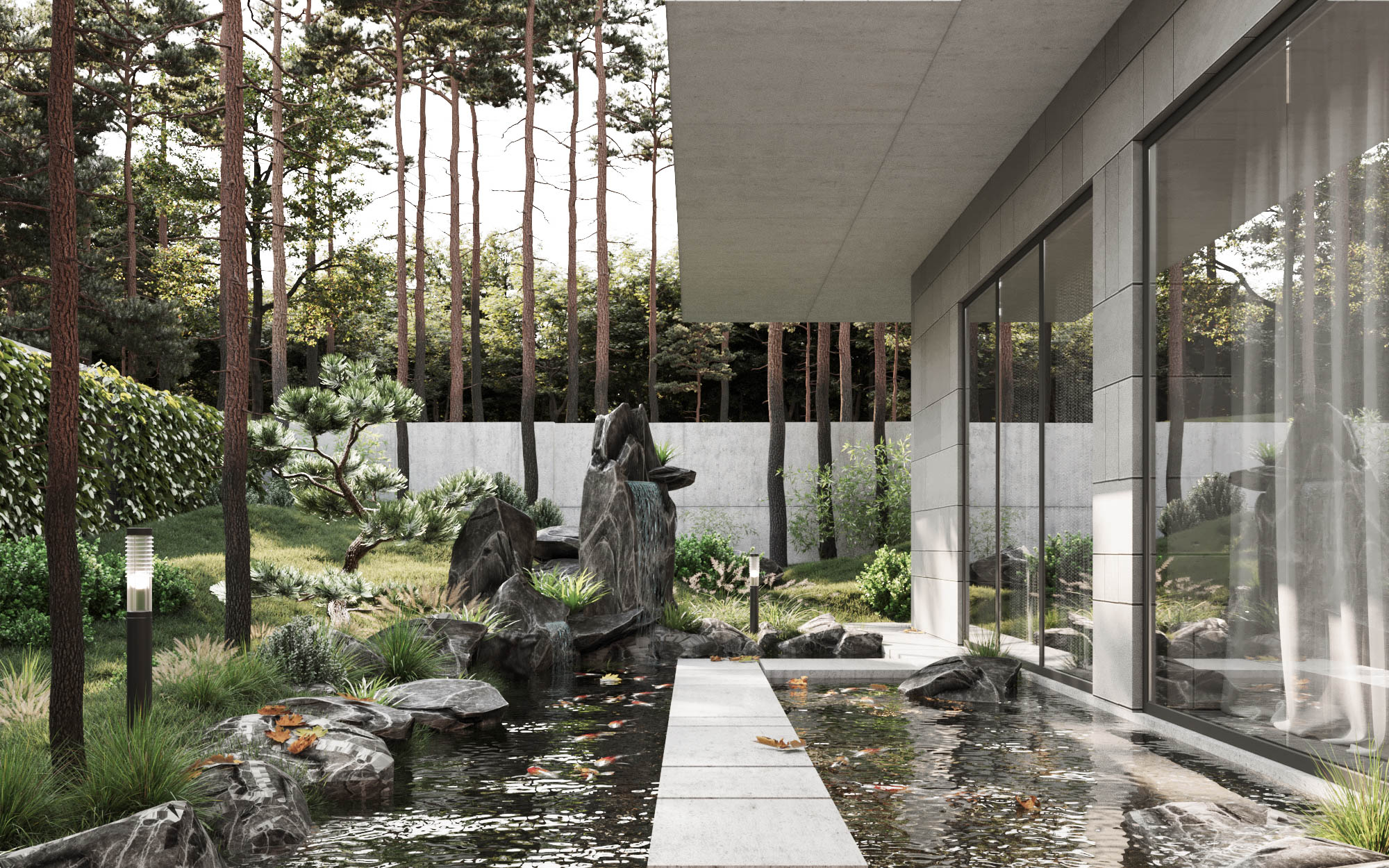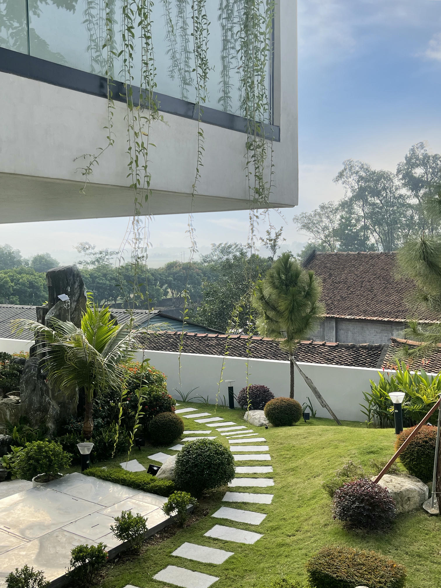 Cảnh quan phía ngoài được bố trí mạch lạc, đóng vai trò làm mềm công trình nhưng không đối nghịch. Sự đan xen giữa vật liệu, mặt nước, mảng xanh và địa hình tự nhiên tạo nên “lớp nền thứ hai”, nâng đỡ toàn bộ cảm xúc không gian.