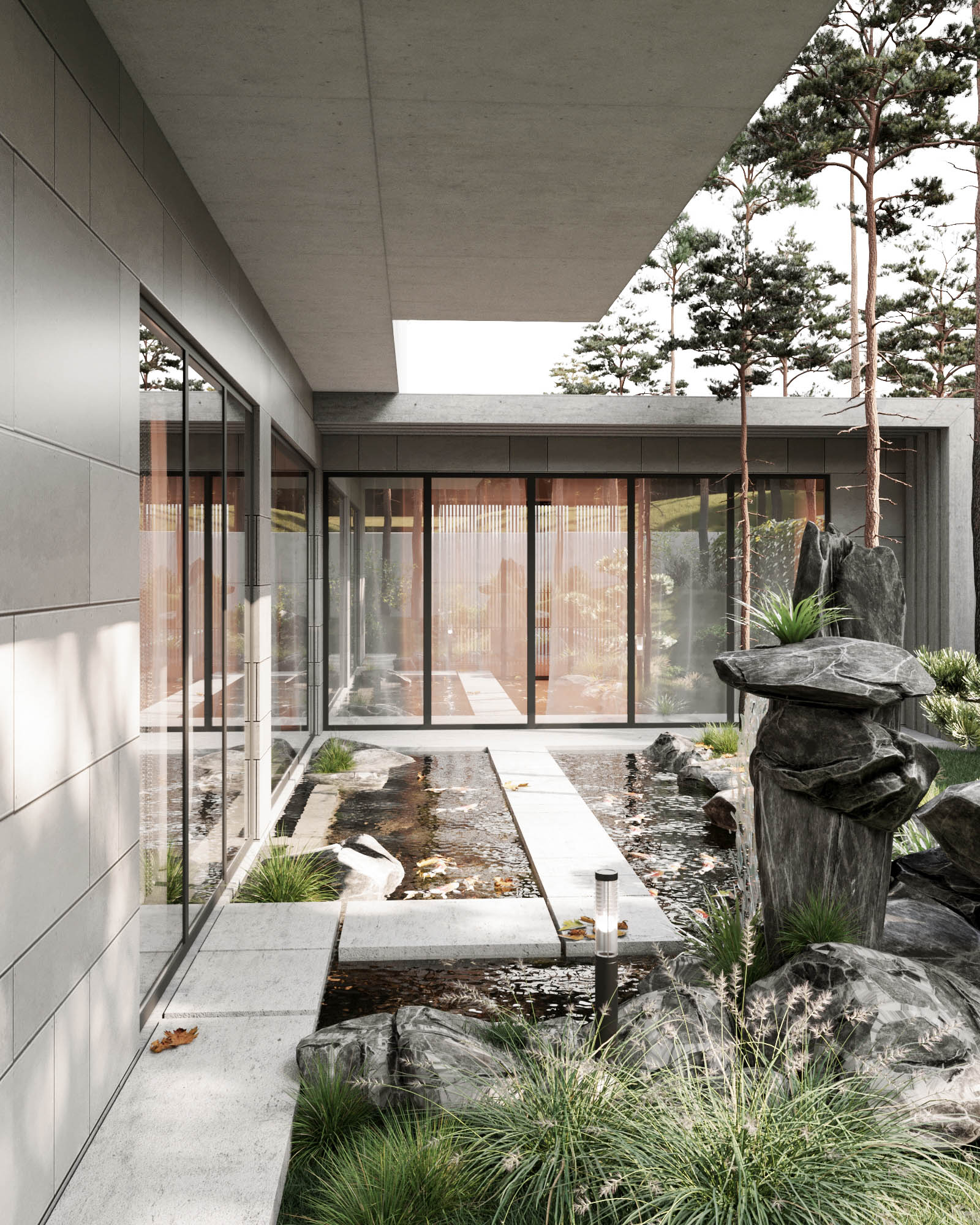 Từng khối nhà như đang đối thoại với cảnh quan: hơi thở thiên nhiên len vào khoảng rỗng; tầm nhìn được mở toang theo phương ngang; và ánh sáng được xử lý có chủ đích để không gian luôn khoáng đạt nhưng không phô trương.