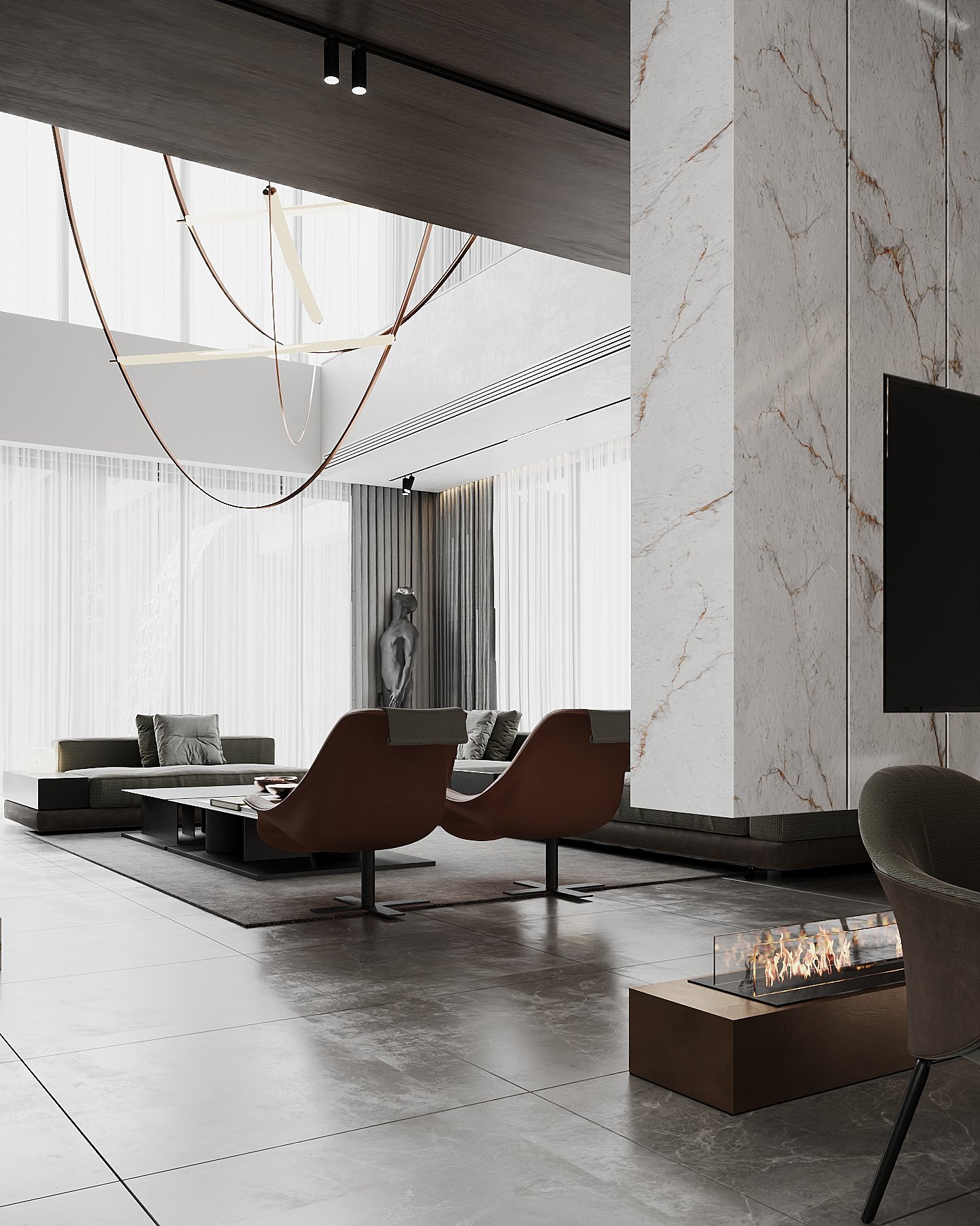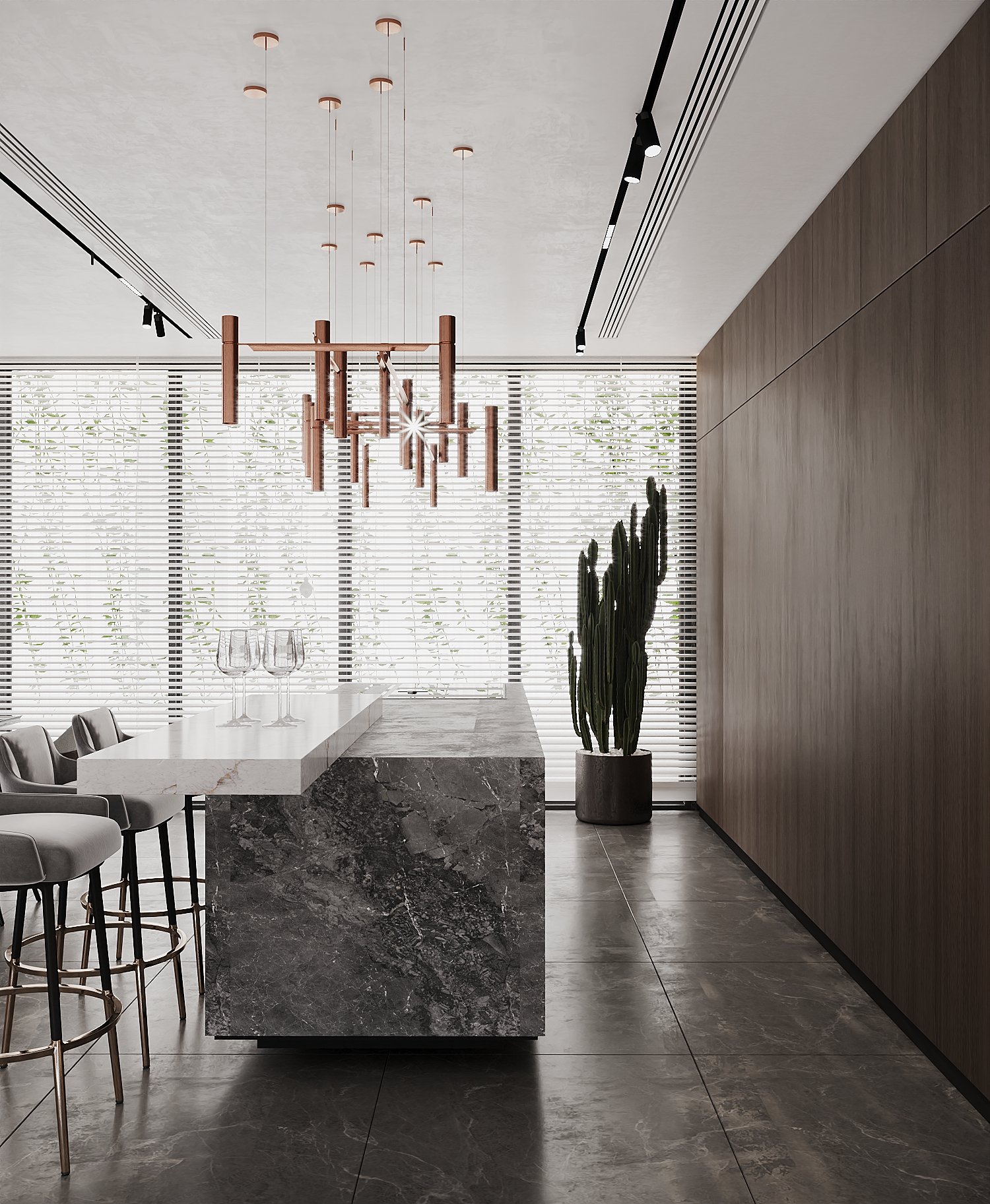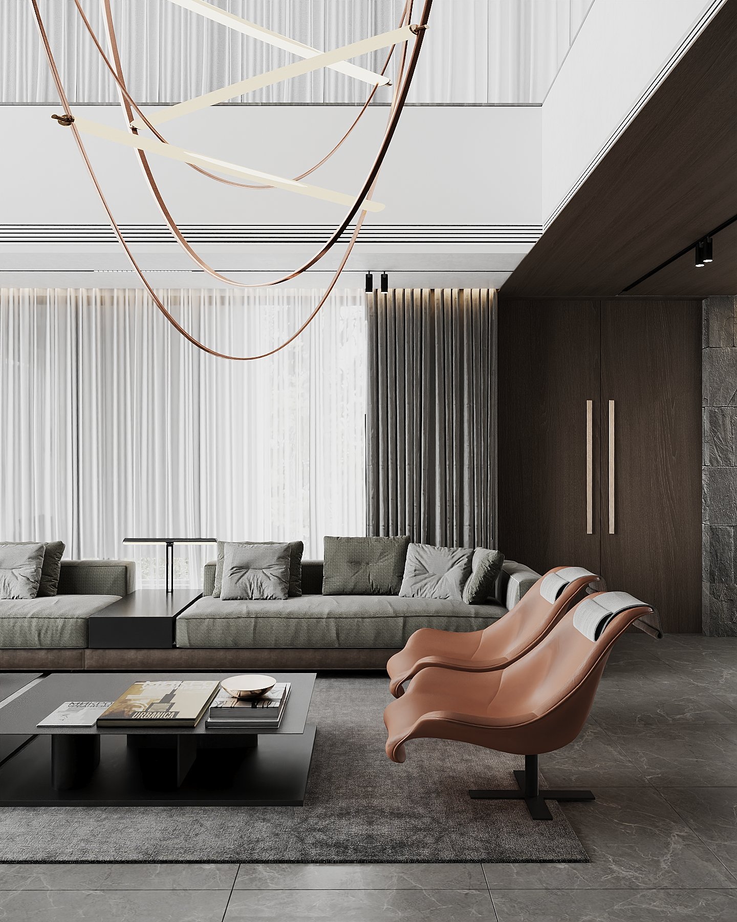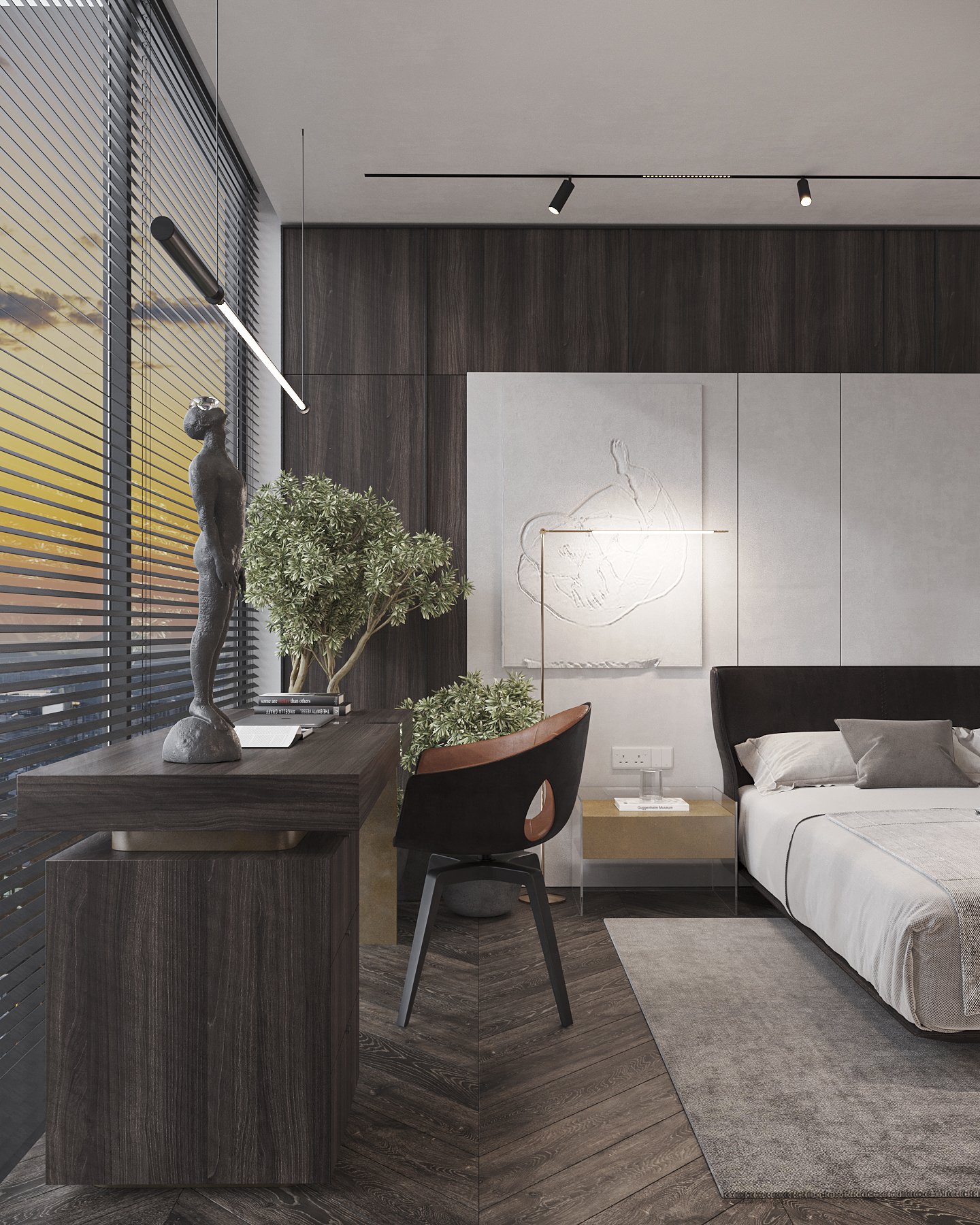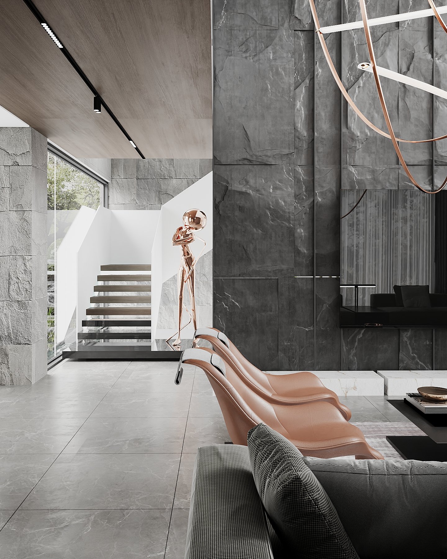 Bước vào bên trong, nội thất là bản mở rộng của kiến trúc: sắc xám – đá – gỗ tạo nên lớp nền sang trọng, tĩnh lặng. Cách tổ chức không gian gãy gọn, chính xác, hướng đến cảm giác thanh lọc và thuần khiết. Phòng khách trần cao tiếp nhận trọn vẹn ánh sáng tự nhiên từ hệ kính lớn; phòng bếp – ăn được thiết kế như một “trục kết nối” mềm mại giữa công năng và trải nghiệm; mỗi phòng ngủ là một thế giới riêng tư, nơi sự tối giản gặp gỡ sự ấm áp.