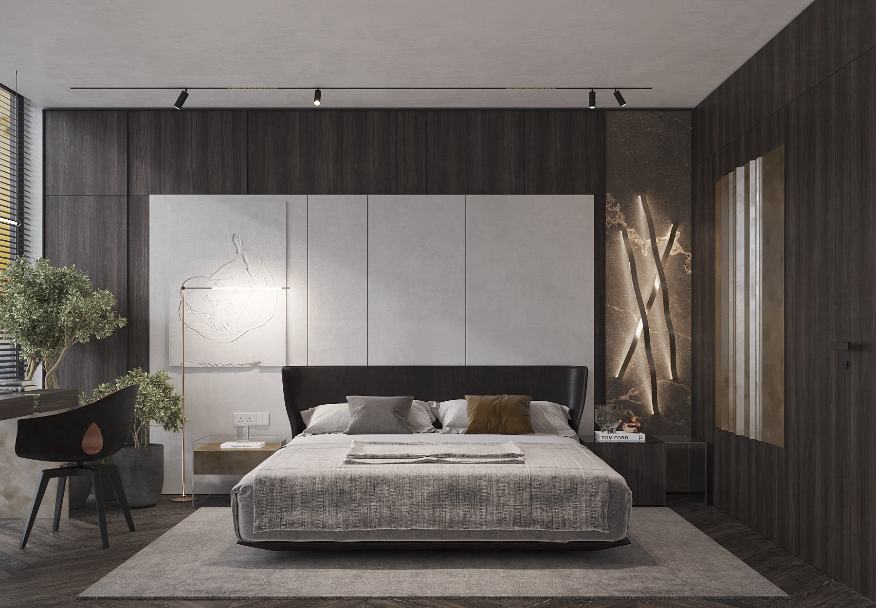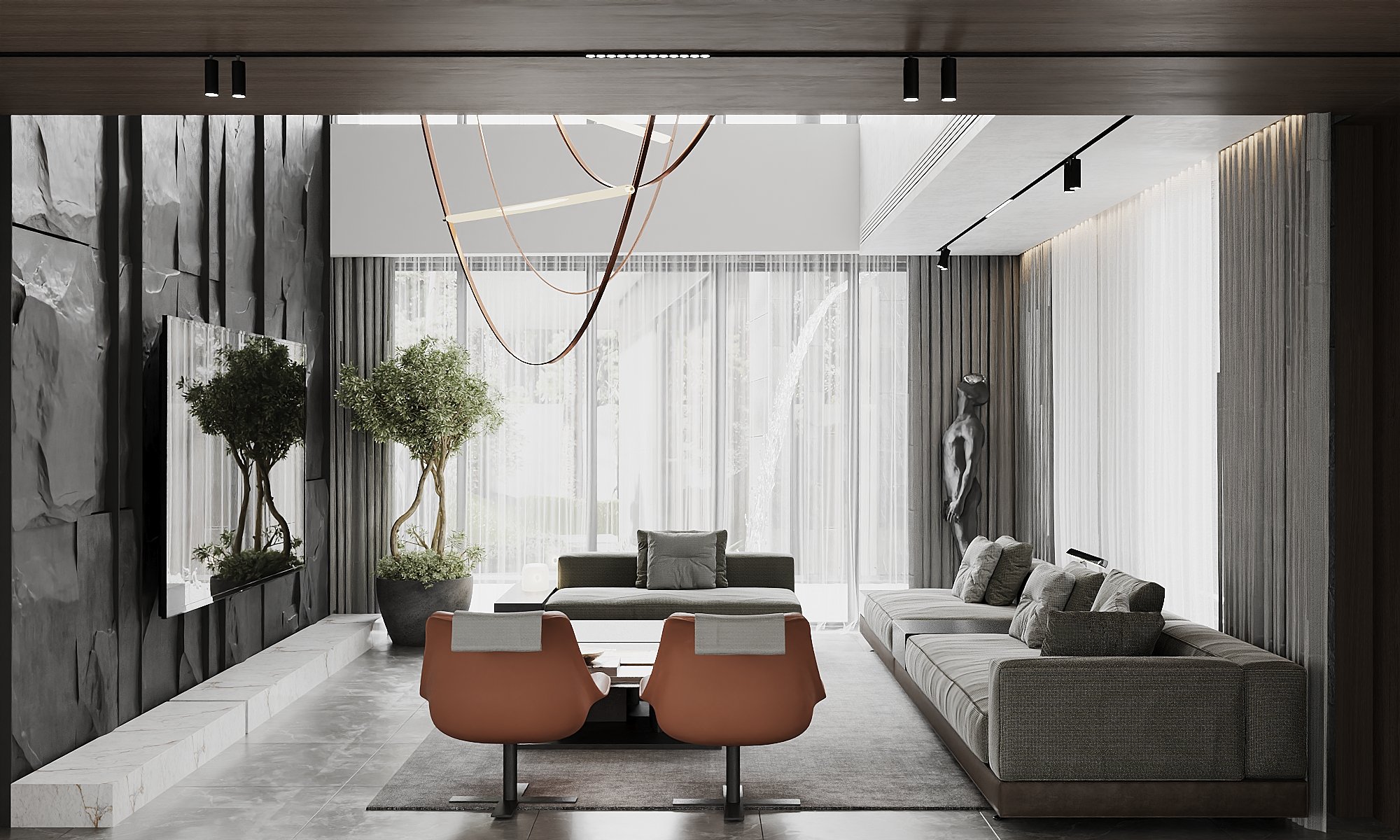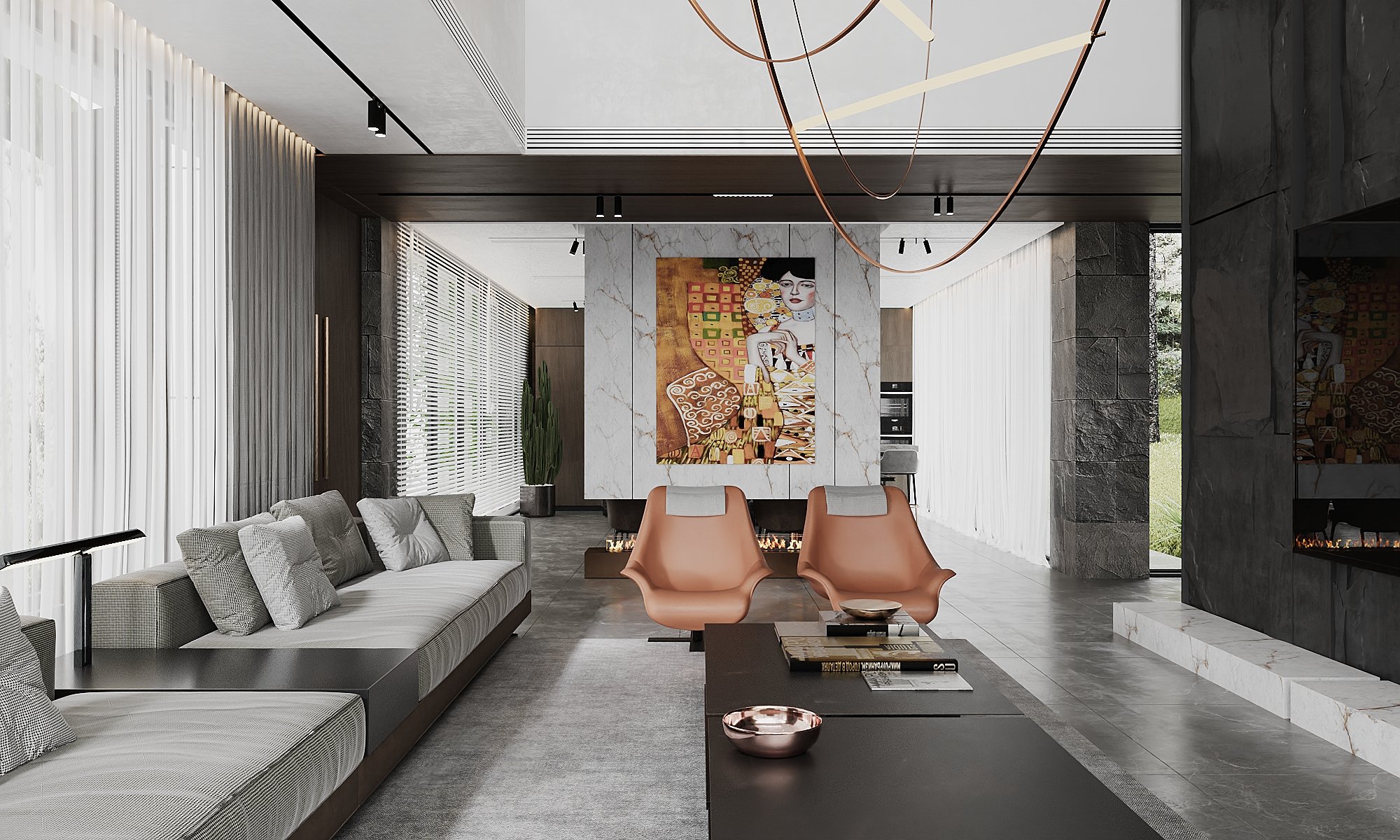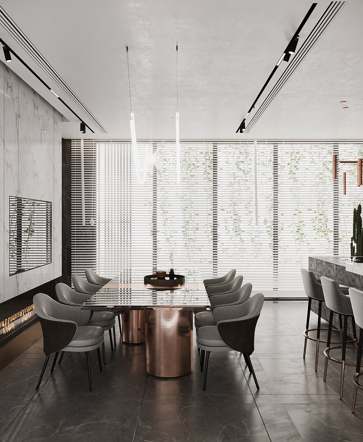 Bước vào bên trong, nội thất là bản mở rộng của kiến trúc: sắc xám – đá – gỗ tạo nên lớp nền sang trọng, tĩnh lặng. Cách tổ chức không gian gãy gọn, chính xác, hướng đến cảm giác thanh lọc và thuần khiết. Phòng khách trần cao tiếp nhận trọn vẹn ánh sáng tự nhiên từ hệ kính lớn; phòng bếp – ăn được thiết kế như một “trục kết nối” mềm mại giữa công năng và trải nghiệm; mỗi phòng ngủ là một thế giới riêng tư, nơi sự tối giản gặp gỡ sự ấm áp.