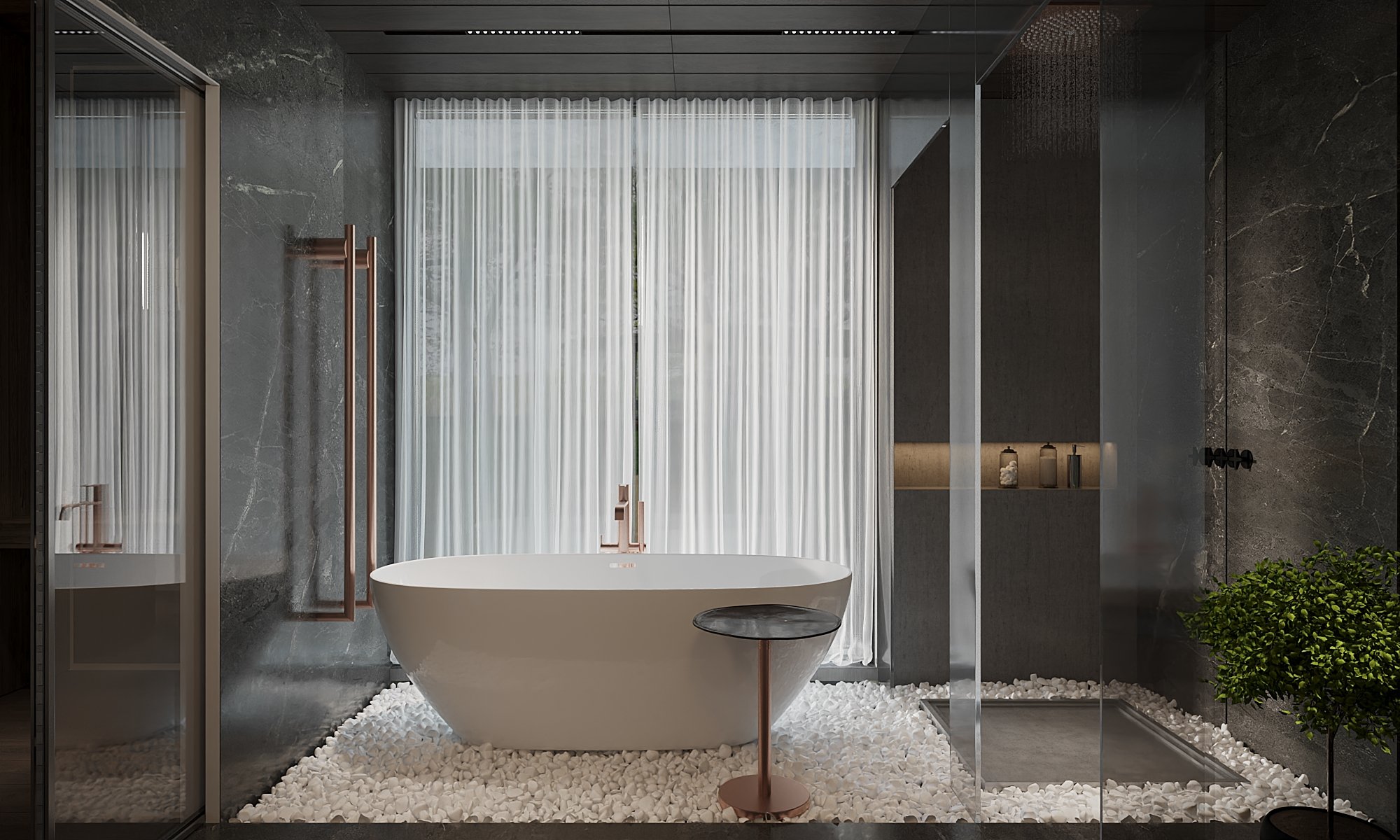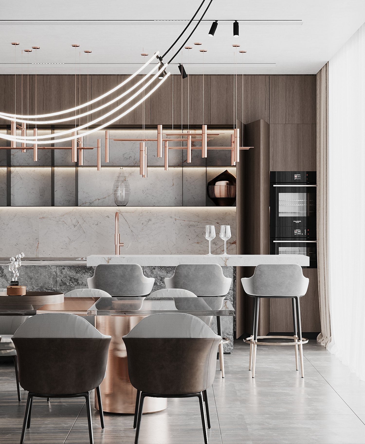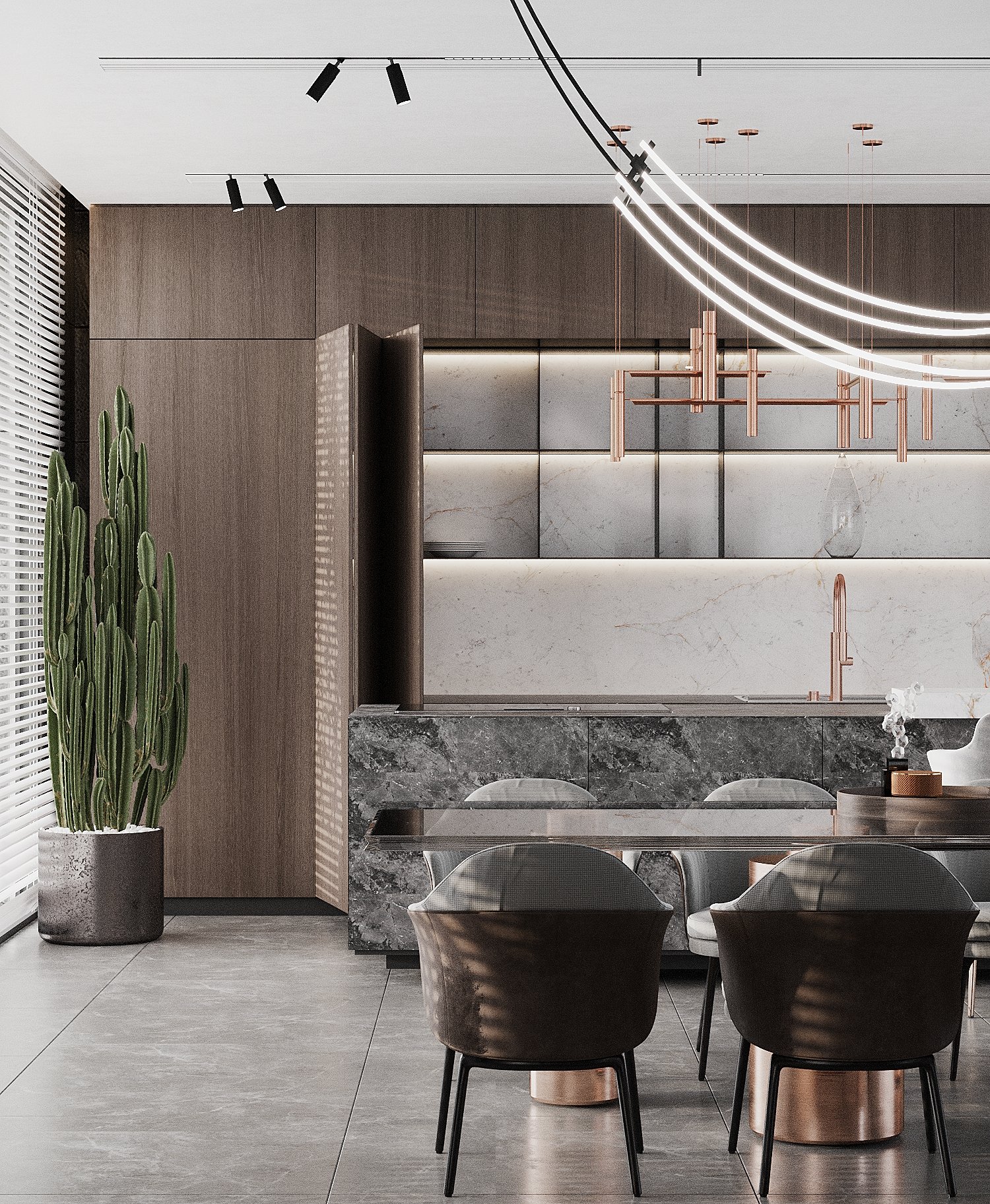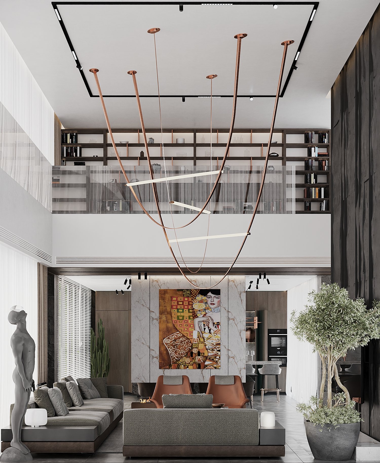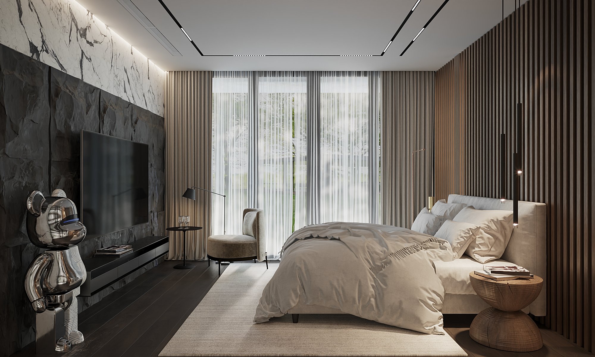 Bước vào bên trong, nội thất là bản mở rộng của kiến trúc: sắc xám – đá – gỗ tạo nên lớp nền sang trọng, tĩnh lặng. Cách tổ chức không gian gãy gọn, chính xác, hướng đến cảm giác thanh lọc và thuần khiết. Phòng khách trần cao tiếp nhận trọn vẹn ánh sáng tự nhiên từ hệ kính lớn; phòng bếp – ăn được thiết kế như một “trục kết nối” mềm mại giữa công năng và trải nghiệm; mỗi phòng ngủ là một thế giới riêng tư, nơi sự tối giản gặp gỡ sự ấm áp.