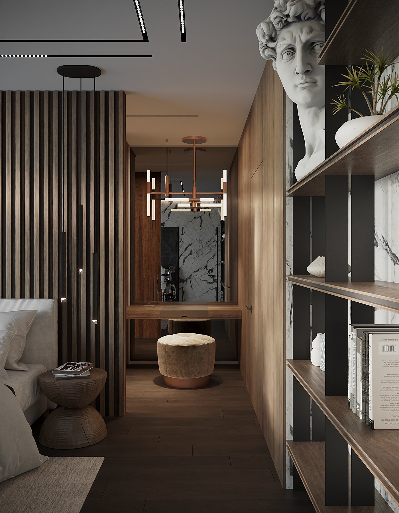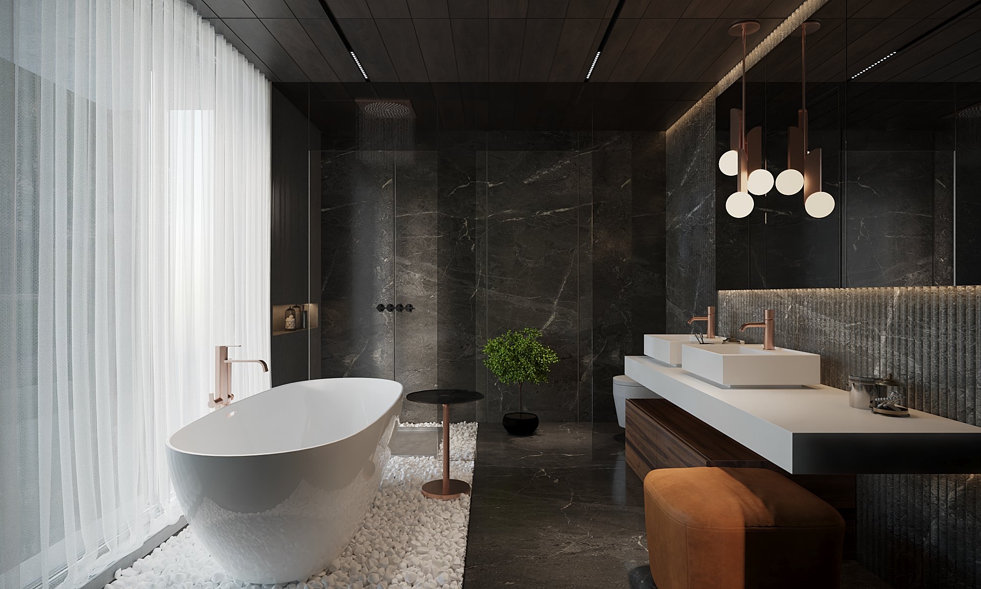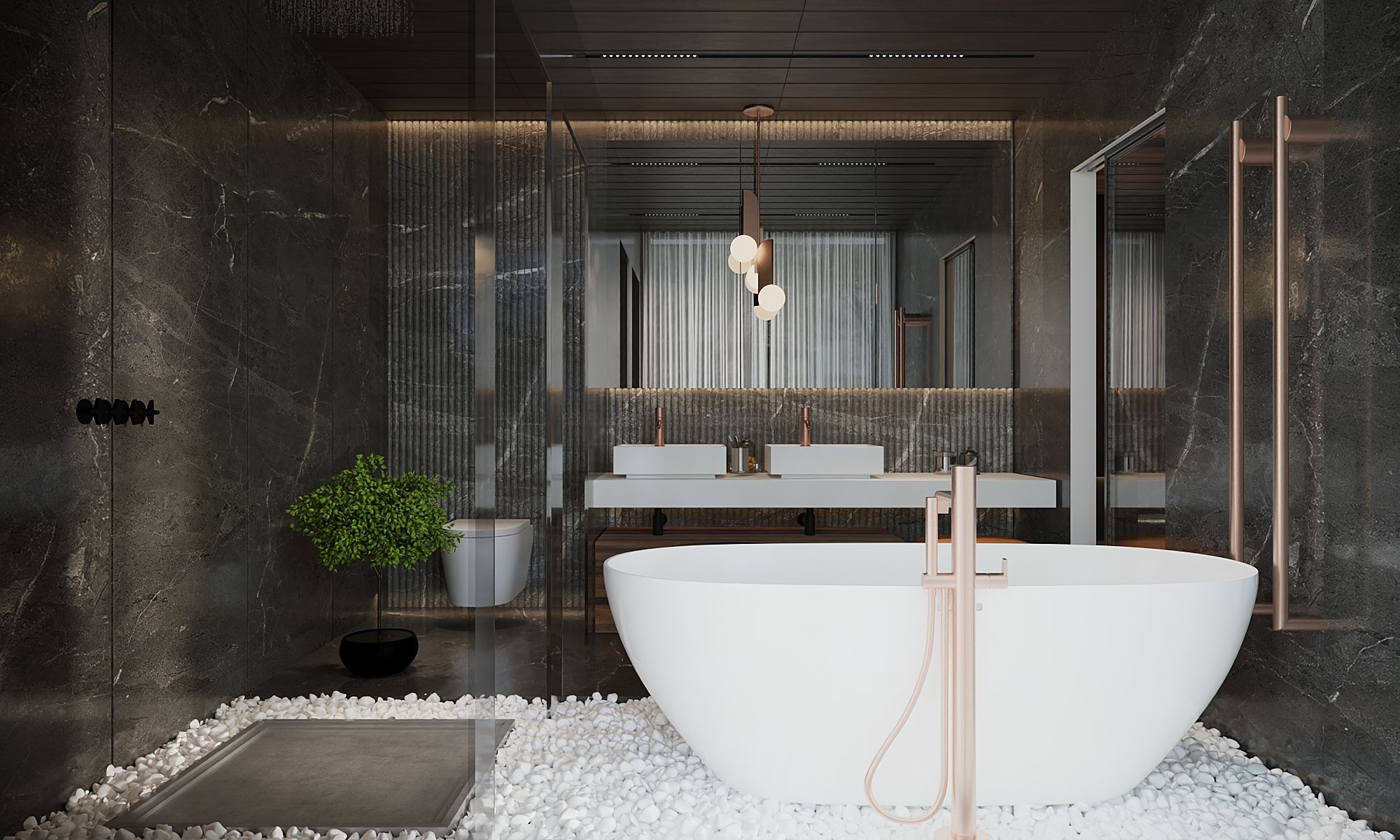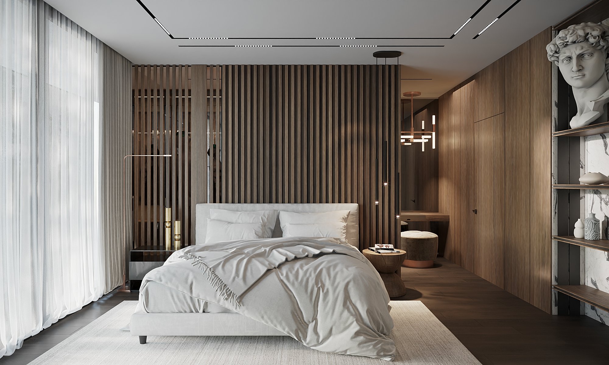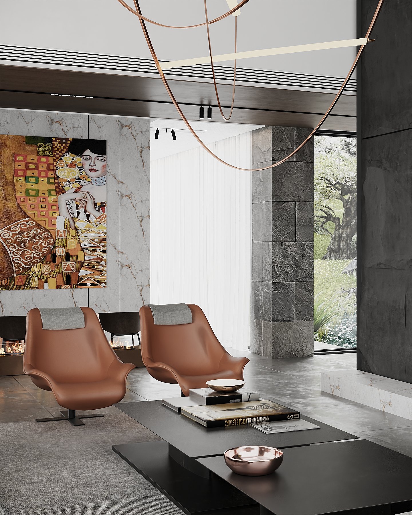 Bước vào bên trong, nội thất là bản mở rộng của kiến trúc: sắc xám – đá – gỗ tạo nên lớp nền sang trọng, tĩnh lặng. Cách tổ chức không gian gãy gọn, chính xác, hướng đến cảm giác thanh lọc và thuần khiết. Phòng khách trần cao tiếp nhận trọn vẹn ánh sáng tự nhiên từ hệ kính lớn; phòng bếp – ăn được thiết kế như một “trục kết nối” mềm mại giữa công năng và trải nghiệm; mỗi phòng ngủ là một thế giới riêng tư, nơi sự tối giản gặp gỡ sự ấm áp.