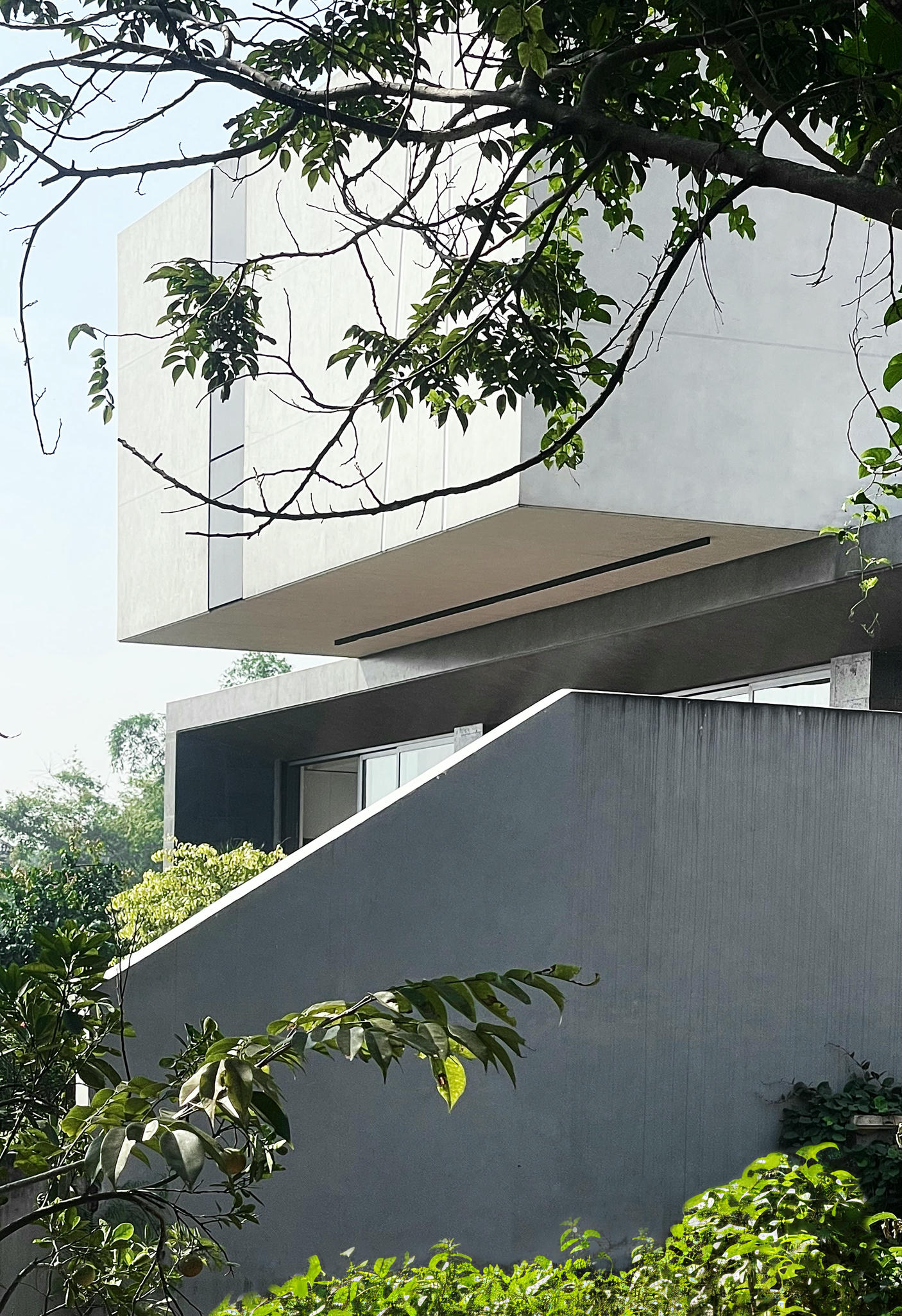 Ngay từ cấu trúc ban đầu, công trình chọn cách xuất hiện tối giản nhưng đầy bản lĩnh: Các khối hộp được xếp lớp chuẩn xác, tạo sự phân tầng mạnh mẽ giữa đặc và rỗng. Những mảng tường bê tông, hệ lam kim loại, và các mặt phẳng kính lớn trở thành bộ ba chủ đạo, tổ chức nên nhịp điệu kiến trúc rõ ràng và không thừa bất cứ đường nét nào.
